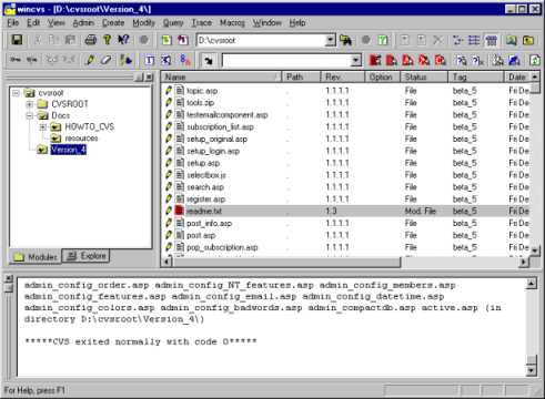 Well first the file has to be edited locally of course. This can be done with his or her favorite editor. Just open the file that is in the repository in cvsroot, edit it and save it. WinCVS doesn't have to be running while the file is being edited. When you've saved the file back into the repository and startup WinCVS you can see that the file has been changed: